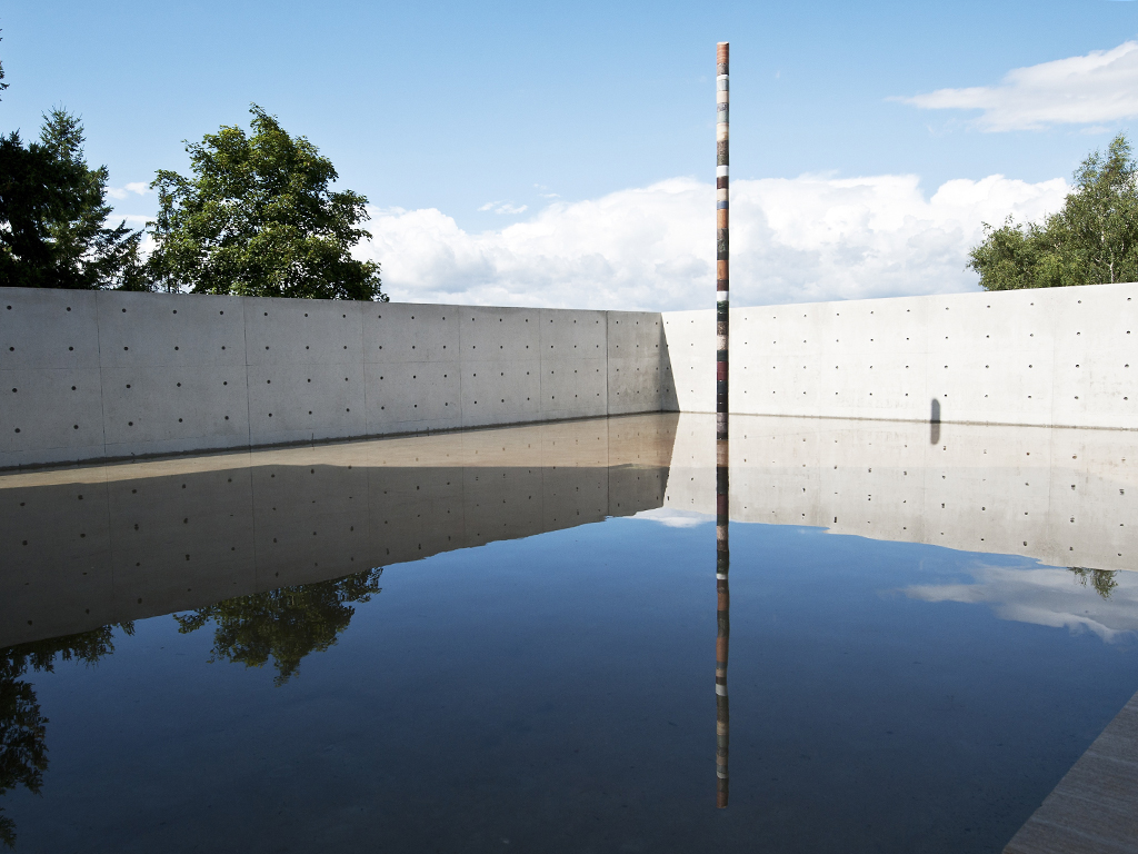 Eine Land Mark nach Norden verbindet den Skulpturenpark mit dem Museumsbau. Der Nord-Süd-Grad ist aus einer Vielzahl von rustikalen Krustenplatten aus allen fünf Kontinenten